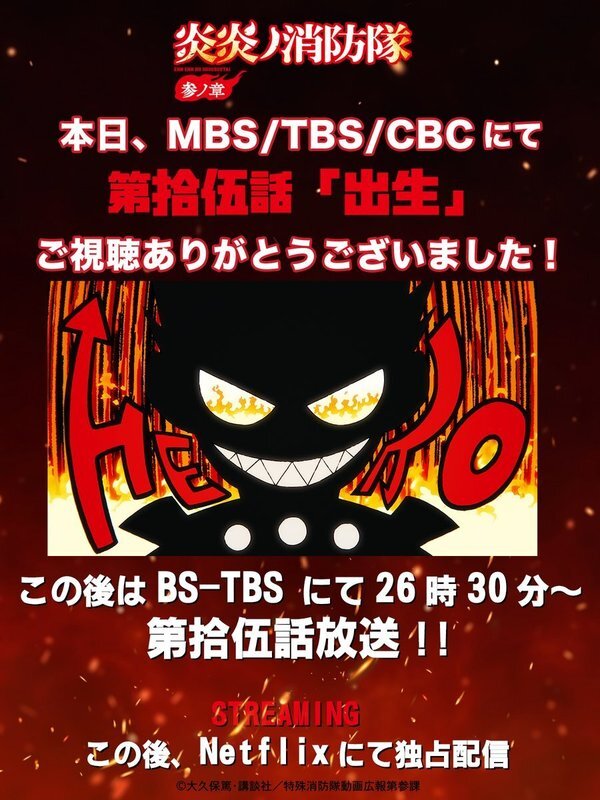 ◤ ̄ ̄ ̄ ̄ ̄ ̄ ̄ ̄ ̄ ̄ ̄ ̄ ̄ ̄◥ 🔥『#炎炎ノ消防隊 参ノ章』🔥 ˗ˏˋご視聴ありがとうございましたˎˊ˗ ◣______________◢ MBS/TBS/CBCにて第拾伍話「出生」の ご視聴ありがとうございました💥 この後はBS-TBSにて 26時30分~第拾伍話が放送‼