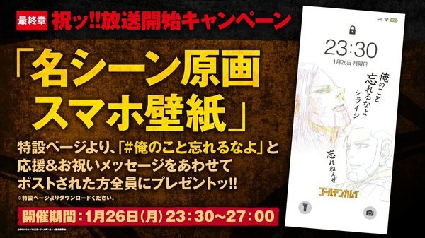 @kamuy_animeTVアニメ『ゴールデンカムイ』公式 2026-01-26 23:30:00TVアニメ『#ゴールデンカムイ』最終章 祝ッ!!放送開始キャンペーン開催ッ!! 特設ページより今週の名言ハッシュタグ「#俺のこと忘れるなよ」と、 応援&お祝いメッセージをあわせてポストされた方全員に、 お礼の「名シーン原画スマホ壁紙」(1種)をプレゼントッ!! 奮ってご参加くださいッ!!