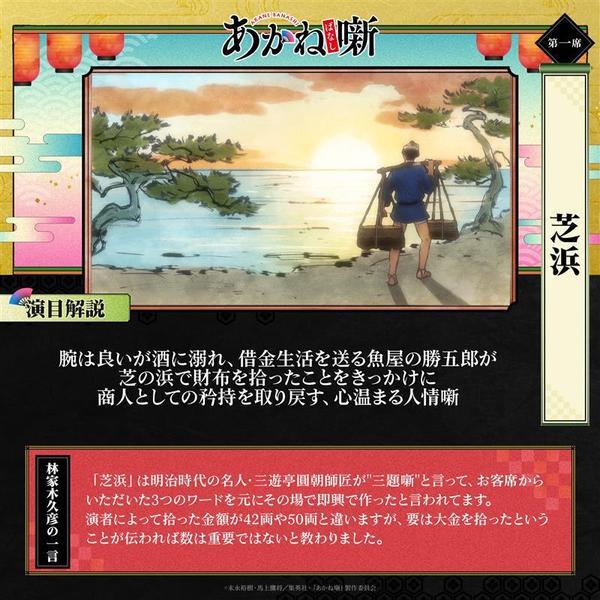 @akanebanashi_PR『あかね噺』公式アカウント@TVアニメ4月4日放送開始! 2026-04-05 00:00:00╔═══════════╗ TVアニメ『あかね噺』 ~落語演目紹介~ ╚═══════════╝ 《第一席:芝浜》 本編に登場した演目をご紹介📝 落語監修:林家木久彦師匠からの一言も🗣️