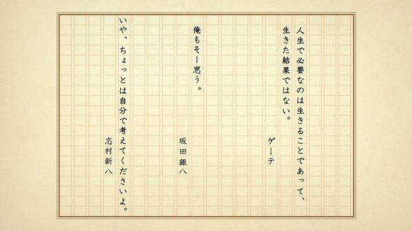 @GOLD70352421 2025-10-28 00:56:18数ある自殺しようとする人物を止めるシーンでも昔読んだ銀八先生の「おもしれえと感じるものがあるうちは生きてたほうがいいんじゃねえの」って言う台詞やけに記憶に残り続けてたわ。杉田の声付きでそれをようやく聞けたのは妙に感慨深い