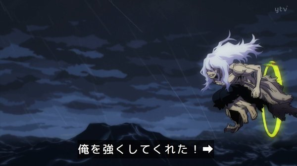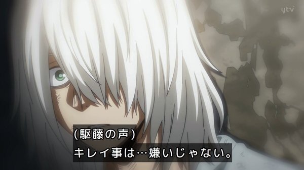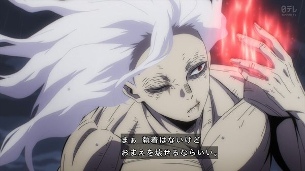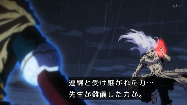 経営科かマスコミか、誰かがまだこの戦いを撮影しているっぽいが、オールマイトとは対照的にヒーローとは思えない姿の人物が、普通なら化け物扱いされる敵を人間扱いしたまま、その過去を無視せず救おうという意志を持ったまま止めるのが全世界に放送されて、オールマイトの次の時代のヒーローの在り方になったらいいのかもしれない