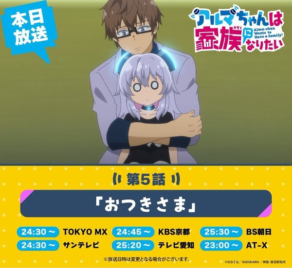 @alma_chan_pr🤖『アルマちゃんは家族になりたい』公式アカウント 2025-11-03 00:30:00// 👪アルマちゃんは家族になりたい 📺第5話地上波放送スタート📺 \\ TVアニメ『アルマちゃんは家族になりたい』第5話「おつきさま」地上波放送がスタート! 順次各局にて放送となりますのでぜひご覧ください! 予告公開中