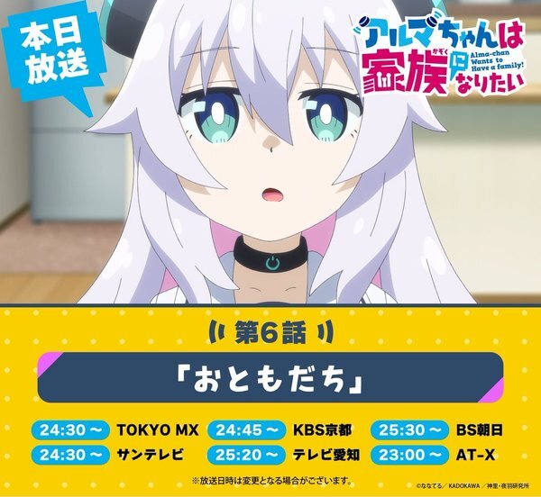 @alma_chan_pr🤖『アルマちゃんは家族になりたい』公式アカウント 2025-11-10 00:30:00// 👪アルマちゃんは家族になりたい 📺第6話地上波放送スタート📺 \\ TVアニメ『アルマちゃんは家族になりたい』第6話「おともだち」地上波放送がスタート! 順次各局にて放送となりますのでぜひご覧ください! 予告公開中