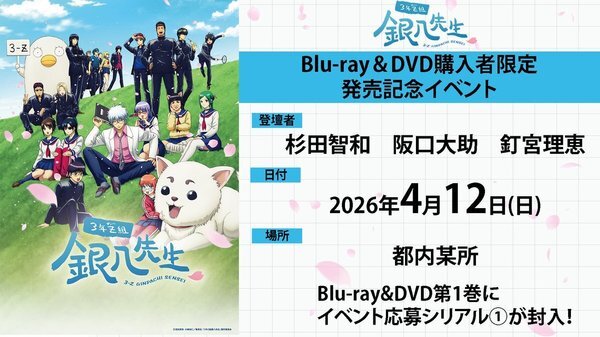 @gintamamovieアニメ銀魂&3年Z組銀八先生 2025-11-18 00:35:00📢3年Z組 BD/DVD発売記念イベント  ̄ ̄ ̄V ̄ ̄ ̄ ̄ ̄ ̄ ̄ ̄ ̄ BD/DVD第1巻封入のイベント応募券で お申し込みいただいた方から抽選で 無料イベントにご招待‼ 📅日程 2026/4/12㊐ 🏫出演 さん さん さん 🛒1巻:12/17㊌発売 aniplex.co.jp/gintama/news/#…