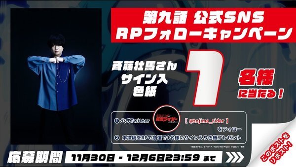 @tojima_riderアニメ『東島丹三郎は仮面ライダーになりたい』公式|好評放送_配信中! 2025-11-30 00:58:00━━━\_/━━━ 放送記念👊💥 RPフォローキャンペーン ━━◥◣_◢◤━━ さんサイン入り色紙を 抽選で1⃣名さんにプレゼント 【応募方法】 1️⃣ @tojima_rider のアカウントをフォロー 2️⃣ このポストをリポスト ✅12月6日23:59まで