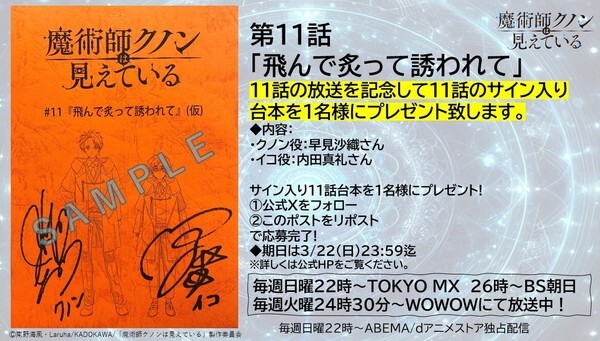 @animekunonTVアニメ「魔術師クノンは見えている」公式 2026-03-15 22:27:00/ 第11話放送記念サイン入り台本プレゼント📦 \ 第11話放送を記念し さん さんサイン入り11話台本を1⃣名様プレゼント❣ 応募方法:本アカウントをフォロー&当ポストをリポストで完了💧 ⏰締切:3/22(日)23:59迄 詳細は👇
