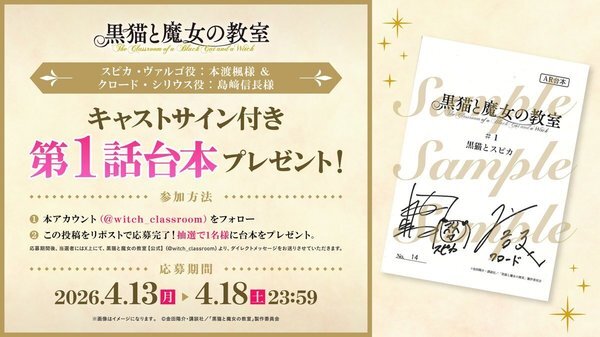 @witch_classroom黒猫と魔女の教室公式【TVアニメ化決定&最新14巻発売中】 2026-04-13 00:25:00⋱第話放送記念🐈⬛⋰ スピカ・ヴァルゴ役 さん クロード・シリウス役 﨑信長 さん サイン付き第話台本を 抽選で1名様にプレゼント🎁 1⃣@witch_classroomをフォロー 2⃣この投稿をリポスト! 締切:4/18(土)23:59まで ※当選はDMにて連絡いたします TVアニメ『#黒猫と魔女の教室』
