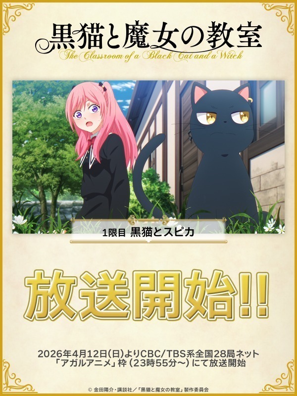 @witch_classroom黒猫と魔女の教室公式【TVアニメ化決定&最新14巻発売中】 2026-04-12 23:55:00⋰ 放送開始💫 ⋱ TVアニメ『#黒猫と魔女の教室』 ₊⚪︎ 第1⃣話 黒猫とスピカ ⚪︎₊ 📺4月12日より CBC/TBS系全国28局ネット「アガルアニメ」枠(日曜夜11時55分~)にて放送開始! その他、放送&配信情報は▽ witch-classroom.com/