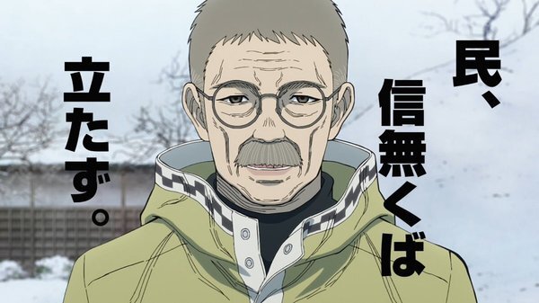 @Oh_BASE_BALL 2026-04-28 00:26:39日本三國 4話 勇気を持って法に背いた者を処刑している青輝たけど、小紀に言われたことを時が経ってもちゃんと行動の指針にしているんだなと思った。それだけ強い思いか。 輪島さんは尊いだけでなく民に優しい総帥だな。農業改革をしてるとことか青輝に似てる。 しかし演出が一々面白い。